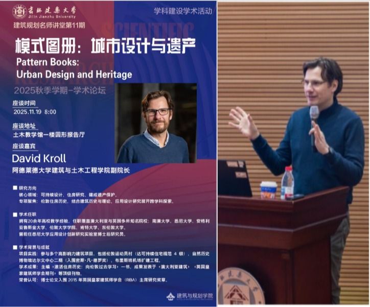 为深入推进建筑学博士点申报工作、推进学科建设、强化建筑学国际交流合作,2025年11月19日,建筑与规划学院主办的“建筑规划名师讲堂”第11期在土木教学馆一楼圆形报告厅成功举行。本期讲座特邀澳大利亚阿德莱德大学(The University of Adelaide )建筑与土木工程学院副院长、副教授David Kroll担任主讲嘉宾,对外合作交流处副处长安宁出席本次活动。讲座由学科建设工作委员会执行主任姜雪主持,建筑与规划学院院长赵宏宇教授致欢迎辞。...